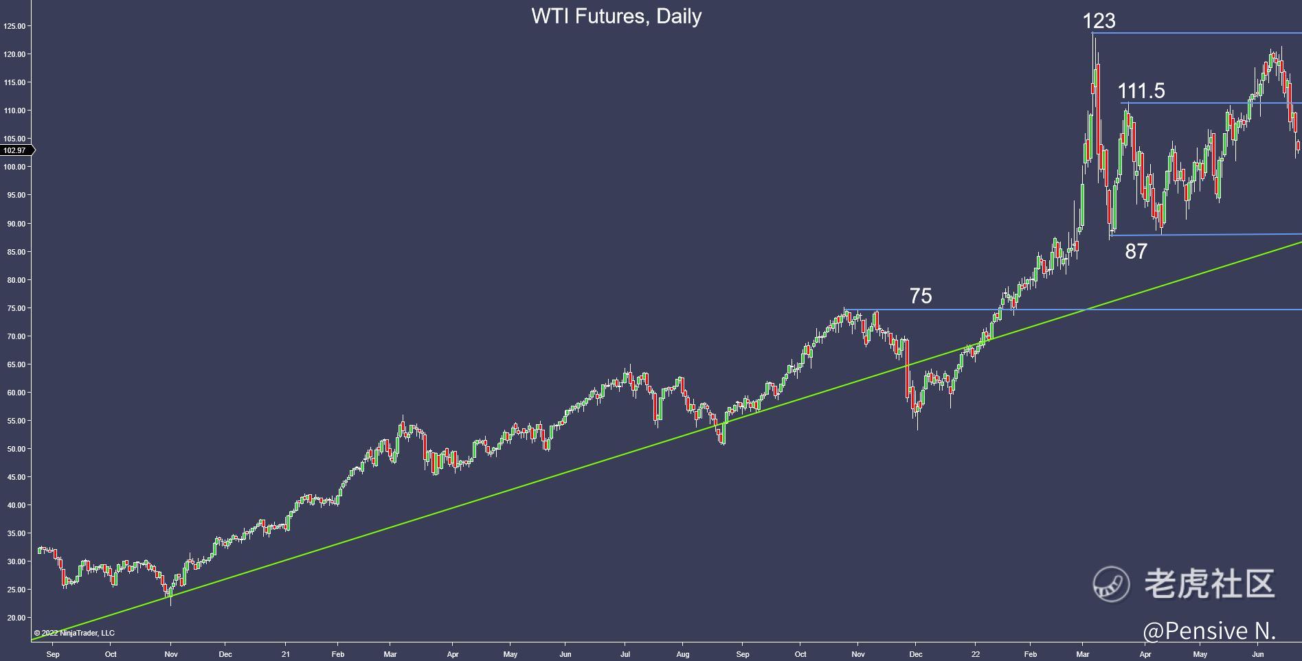 - WTI failed to test its current cycle highs ~123 before tumbling lower, now trading slightly above $100