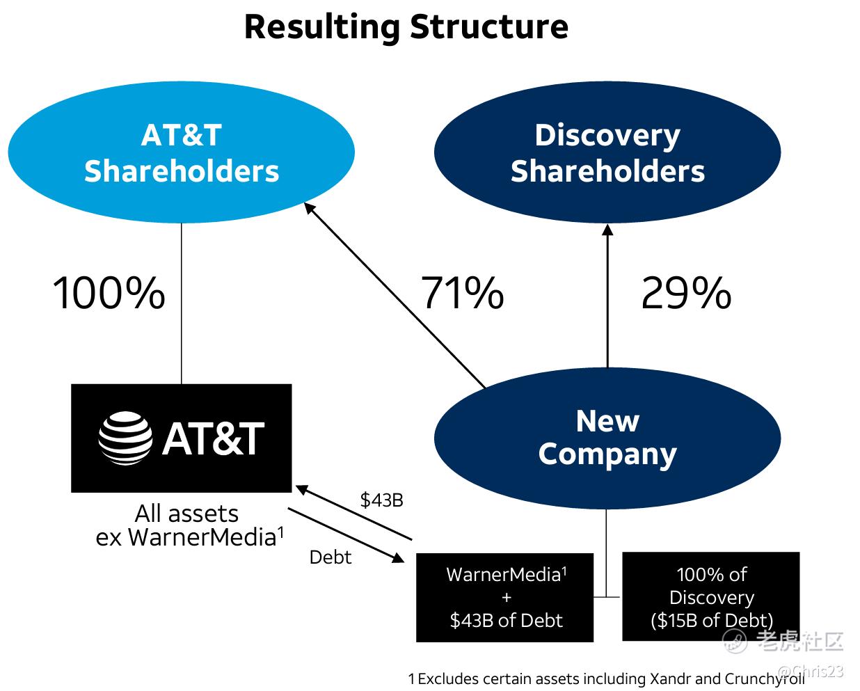 The transaction was structured as a Reverse Morris Trust transaction (Figure 1) where Discovery contributed 100% of its business and received 29% of common equity and AT&T received $43B in a combination of cash, debt securities and WarnerMedia's retention of certain debt in exchange for 71% of common equity in the merged company.