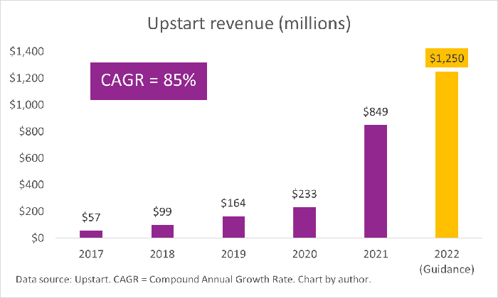 Regardless, assuming Upstart achieves its revenue target of $1.25 billion in 2022, it will have grown by a compound annual growth rate of 85% since 2017.