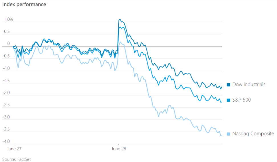 The US stock market fell across the board, and the S&P 500 index returned to the bear market. The S&P 500 index closed down 78.81 points, or 2.02%, to 3821.30 points; The Dow Jones index closed down 490.48 points, or 1.56%, to 30,947.78 points; Nasdaq closed down 344.77 points, or 2.99%, to 11,179.78 points.