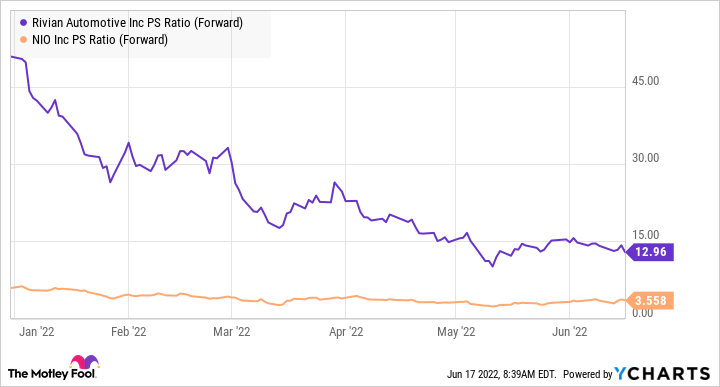 While Nio has amarket capof $32 billion compared to about $24 billion for Rivian, there's good reason for it to be worth more to investors. While neither is yet earning profits, one way to value them right now is with aprice-to-sales (P/S) ratiobased on expected 2022 sales. And there's a big difference there.