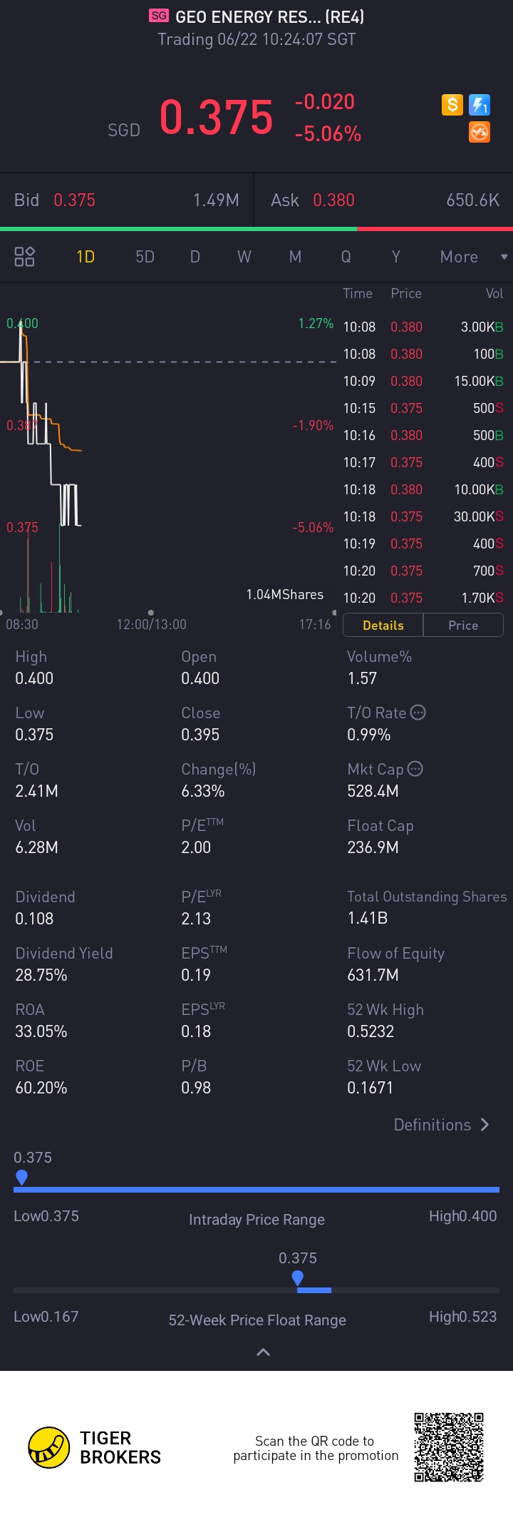 $GEO ENERGY RESOURCES LIMITED(RE4.SI)$Market maker keep selling down the stock. Resserval not at sight. Have to take a medium view about 6 months.