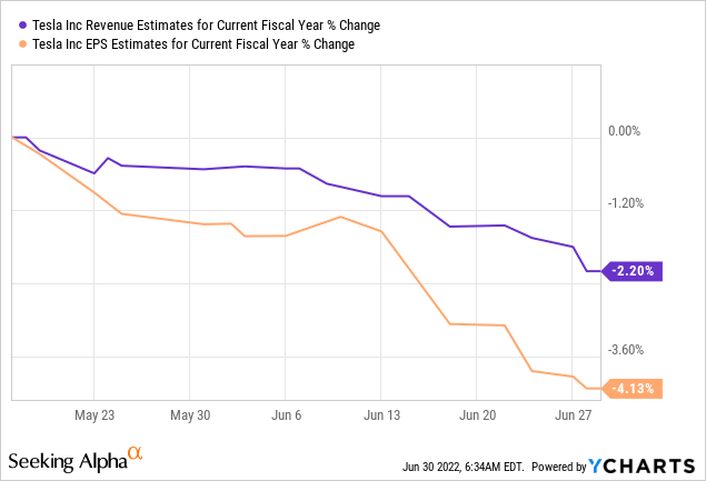 Over the past seven weeks, revenue and EPS estimates for FY 2022 have been going down, something which is very unusual when it comes to Wall Street expectations out of Tesla.