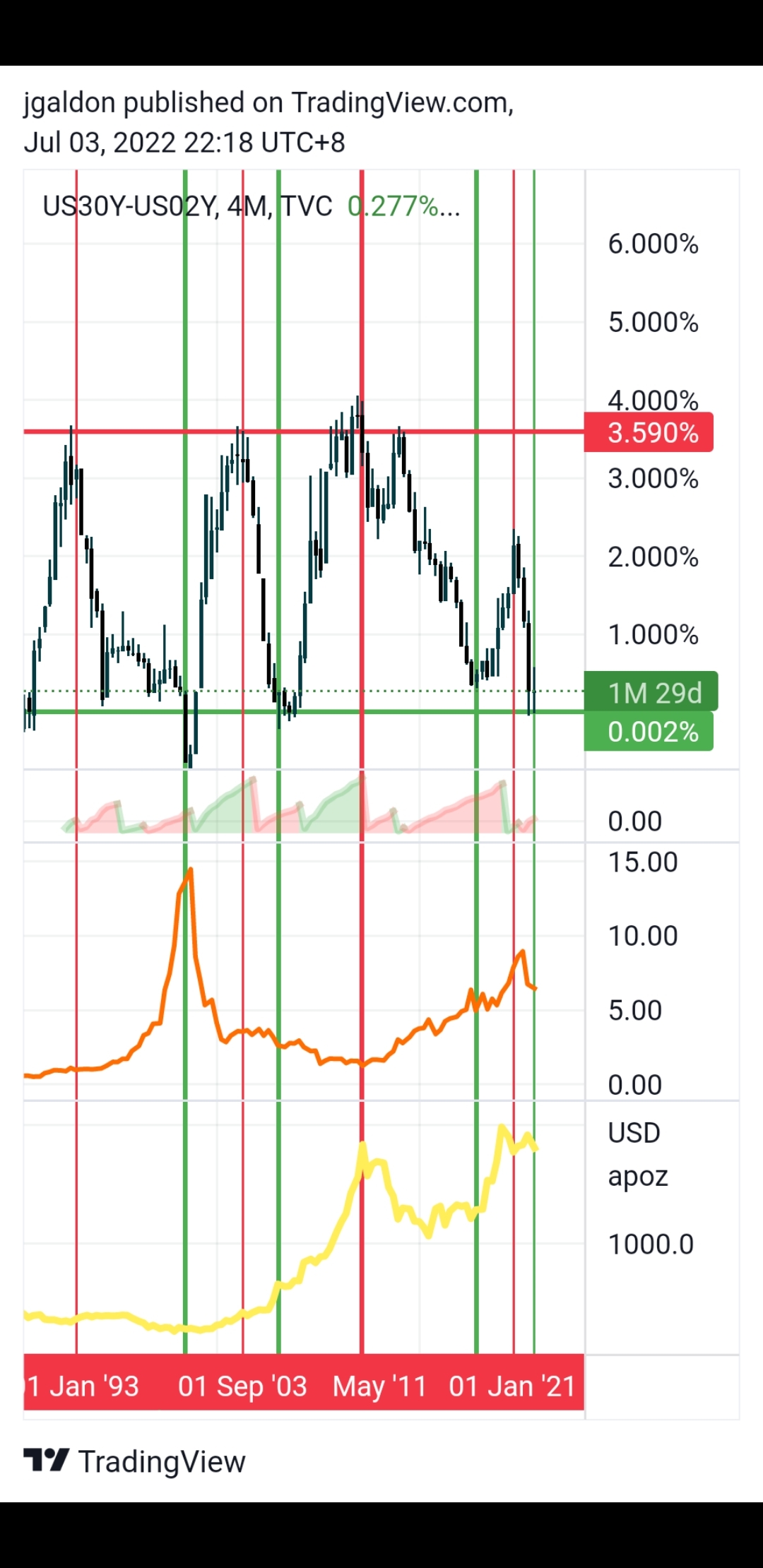 Rates spread 30-2Years, Nasdaq/Gold & Gold...can Gold go lower? Yes, look at 93 to 2003.
