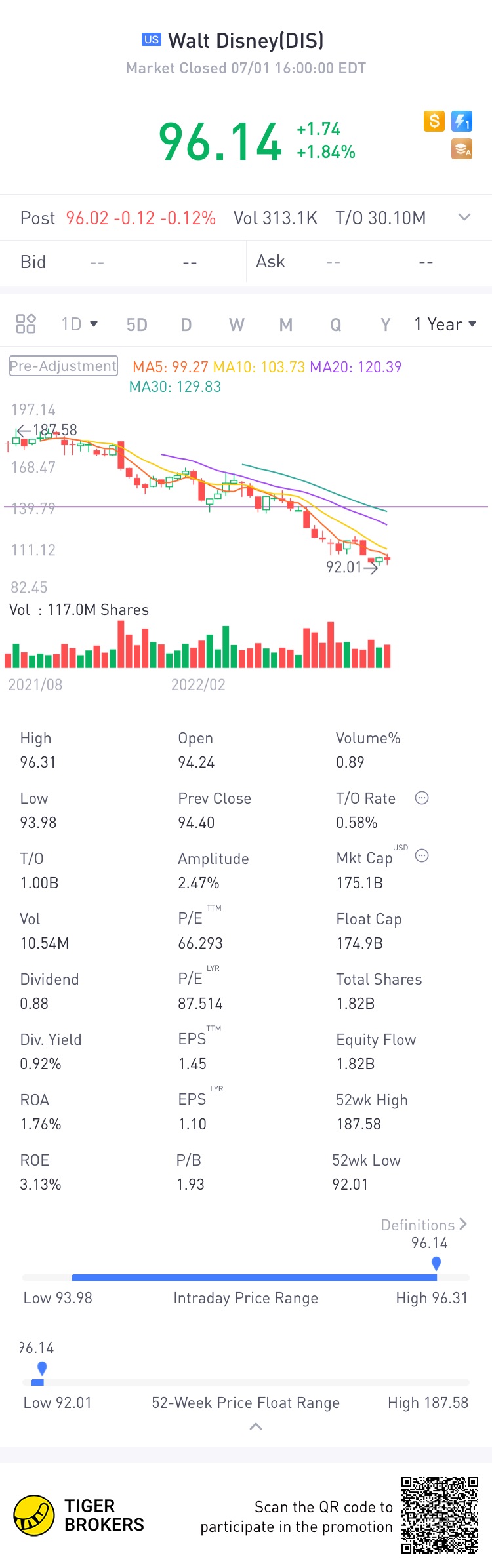 $Walt Disney(DIS)$1H 2022 has been a washout for the stock - inspite of pandemic reopening, July 4th weekend sold out at Disneyland Florida, Shanghai reopening, relative better performance of Disney+ vs Netflix etc etc- but the stock ...
