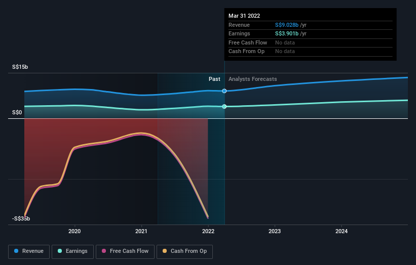 As you can see, institutional investors have a fair amount of stake in United Overseas Bank. This suggests some credibility amongst professional investors. But we can't rely on that fact alone since institutions make bad investments sometimes, just like everyone does. When multiple institutions own a stock, there's always a risk that they are in a 'crowded trade'. When such a trade goes wrong, multiple parties may compete to sell stock fast. This risk is higher in a company without a history of growth. You can see United Overseas Bank's historic earnings and revenue below, but keep in mind there's always more to the story.