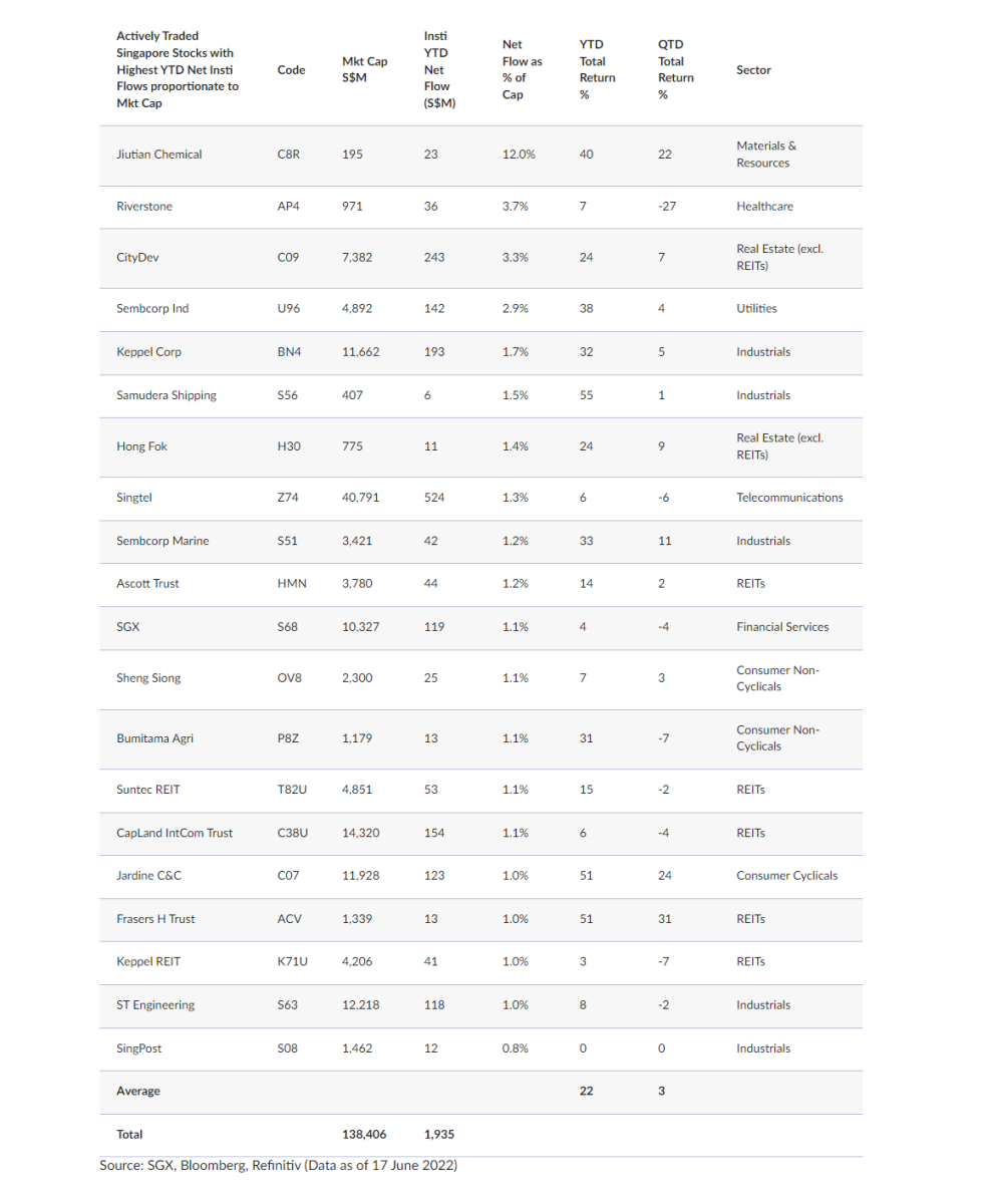 Looking at the overall Singapore stock market, the 2022 year-to-date net institutional inflow was S$74 million.