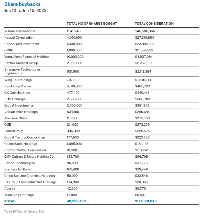 There were 26 primary-listed stocks conducting share buybacks over the 5 sessions ended Jun 16, with a total consideration of S$122.8 million, more than doubling the previous week’s consideration tally.