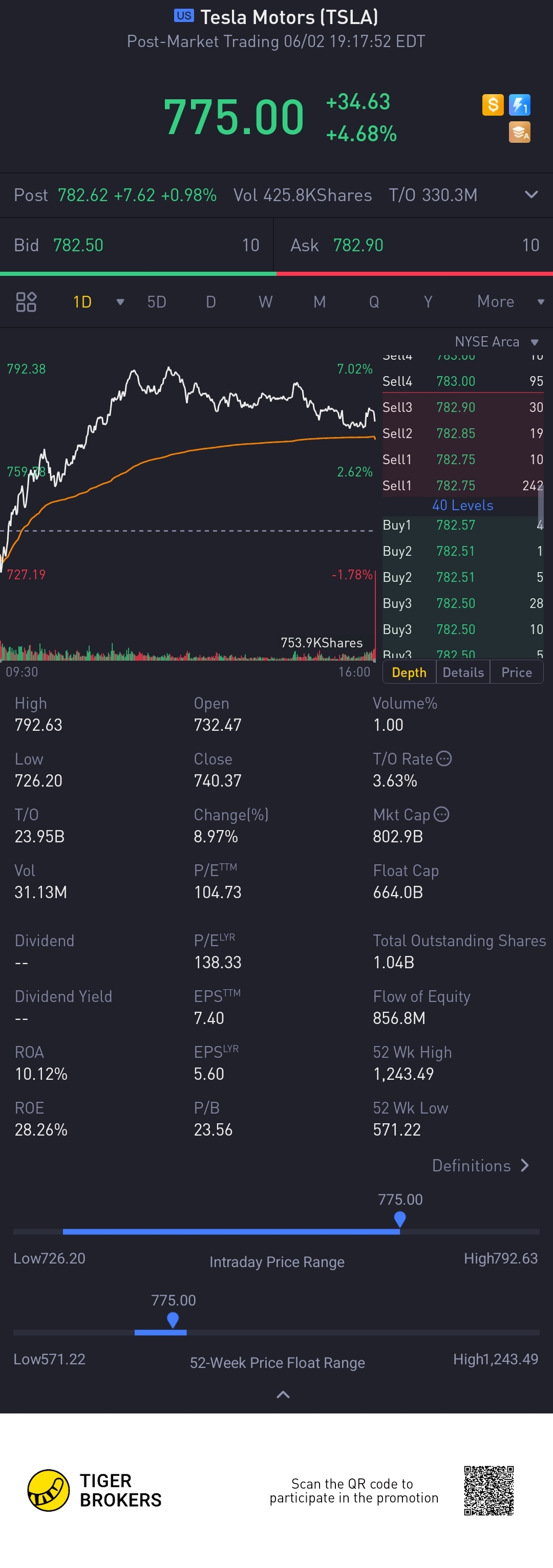 $Tesla Motors(TSLA)$king if meme stocks trying ti make a come back haha... resistance to be strong at 790 800.... again be careful of this bear market rally. Many macro factors are still around. Though if we have found a bottom I would totally be fine as well!