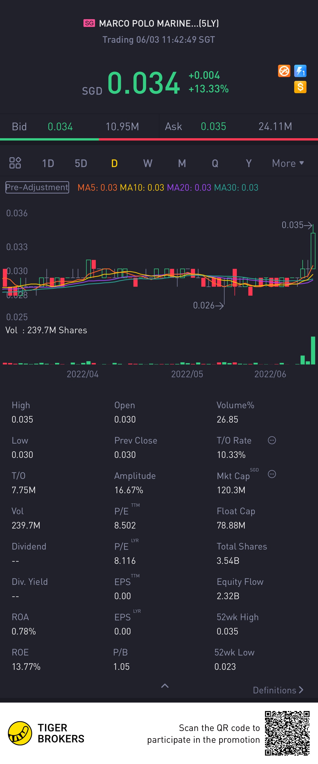 $MARCO POLO MARINE LTD.(5LY.SI)$MPM hasbeen consolidated for many months and today we see good breakout after good review from analysts for on track turnaround and better performance. Good catalyst for more renewable energy contracts maintain a 'buy' recommendation. πππ