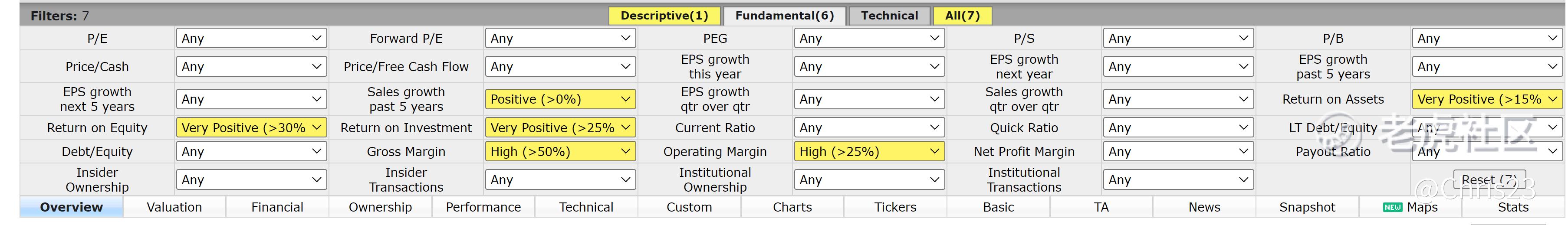 For an example to screen for high quality stocks, I used Finviz's stock screener tool to screen for companies using the following parameters: