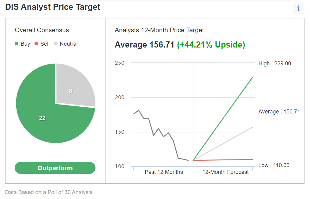 In an Investing.compollof 30 analysts, the majority rated Disney a buy.