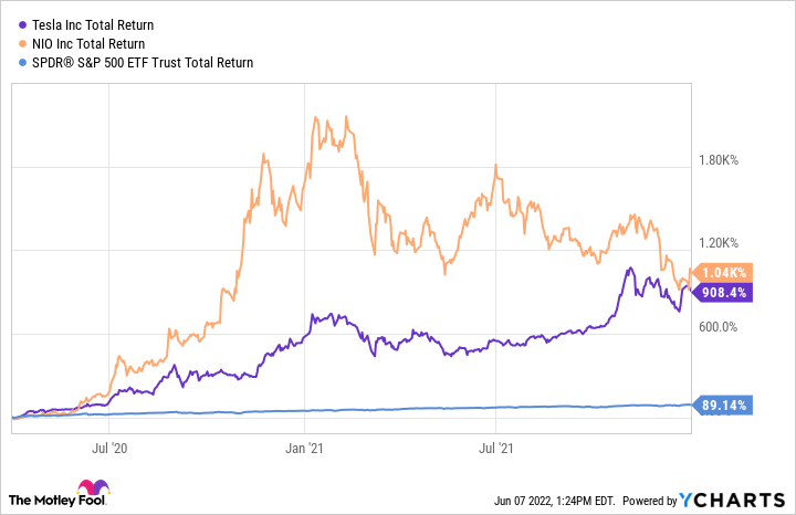 It is unclear exactly why investors got so excited about EV stocks, but the excitement went into overdrive coming out of the March 2020 market lows. For example, both Tesla and Nio$NIO Inc.(NIO)$ $NIO Inc.(NIO.SI)$ $NIO-SW(09866)$ (NIO7.77%)soared over 1,000% from March 2020 to the end of 2021, greatly outpacing the S&P 500's 89% total return during that timespan.