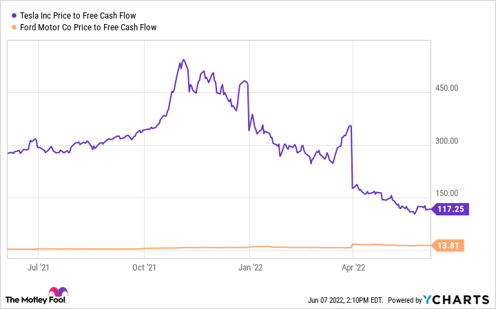 Second, the stocks are still valued richly compared to legacy automakers. For example, Tesla trades at a price-to-free cash flow (P/FCF) over 100, while Ford only trades at a P/FCF of 13.8. Tesla may grow more quickly than Ford, but it's not like the legacy carmaker is sitting down and watching the EV revolution pass it by.