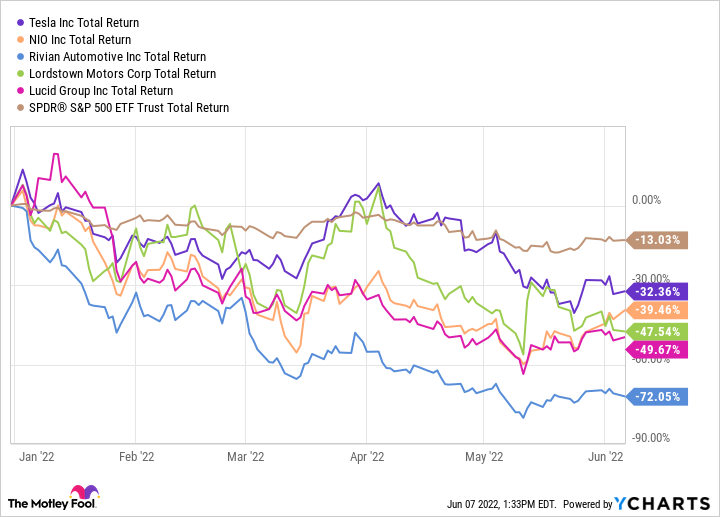 But now, in the middle of 2022, much of that enthusiasm has waned, with share prices down considerably from all-time highs, potentially providing a buying opportunity for long-term investors. Let's see whether now is the right time to buy some EV stocks.