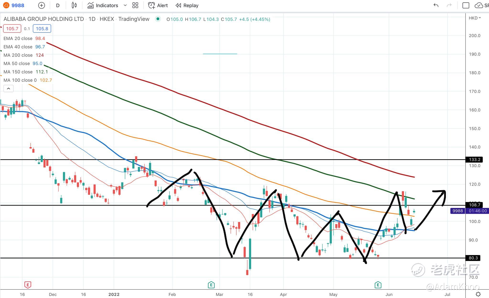 Of course, when the 50MA crosses back above the 150MA (both Moving average sloping up) and the price crossing back above 200MA (200MA slopes up) will mark a change in the medium and long-term trend to up as well.