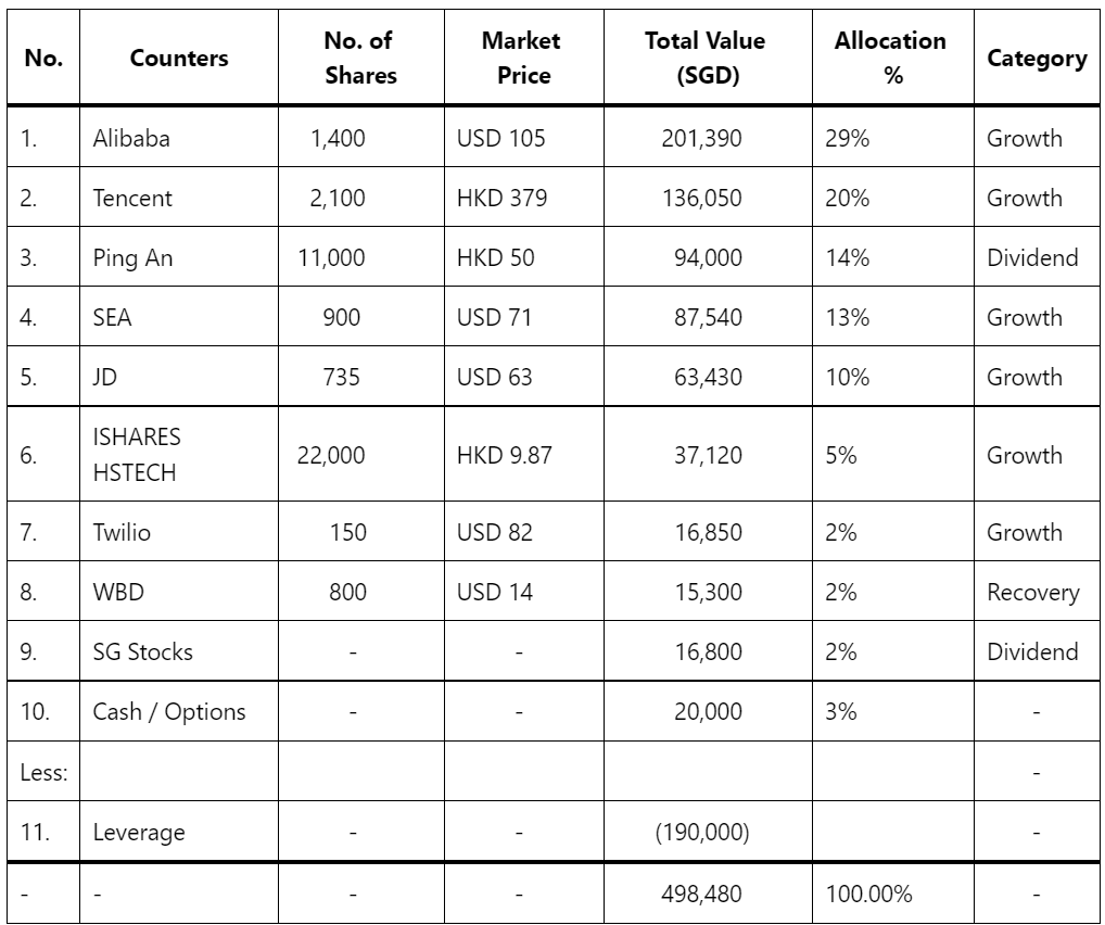 At one point, several of my US (e.g SEA) and HK positions (e.g Tencent and JD) were green on a rare week so I think it is just a matter of time before these positions turn positive when sentiments return back. As for now, the longer the blood on the street remains, the better the opportunity to accumulate to get into some very attractive average entry price.