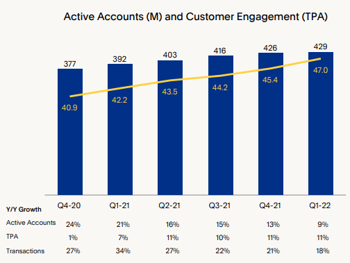 On a year-on-year basis, the number of active accounts for PayPal has been growing at a slower rate since Q4 2020. Back then, active accounts grew 24% compared to the previous year while in Q1 2022 this same metric grew 9%.