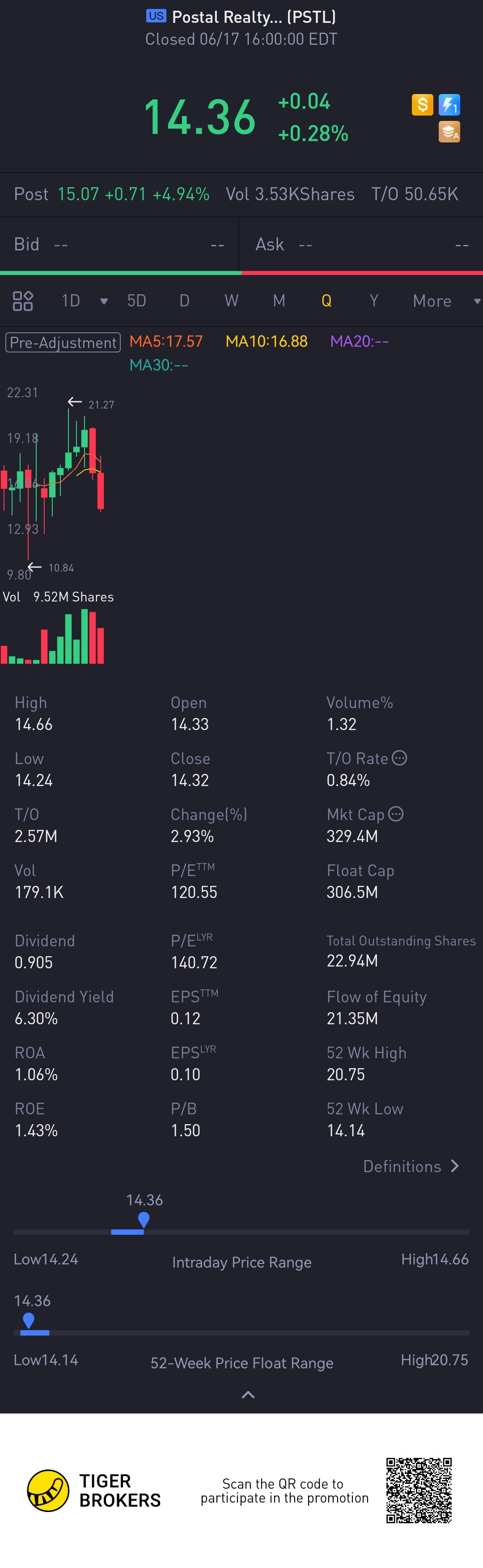 $Postal Realty Trust, Inc.(PSTL)$ Tempted to buy this as its a postal realty REITs. Though PE is high, the dividend yield looks good to me.