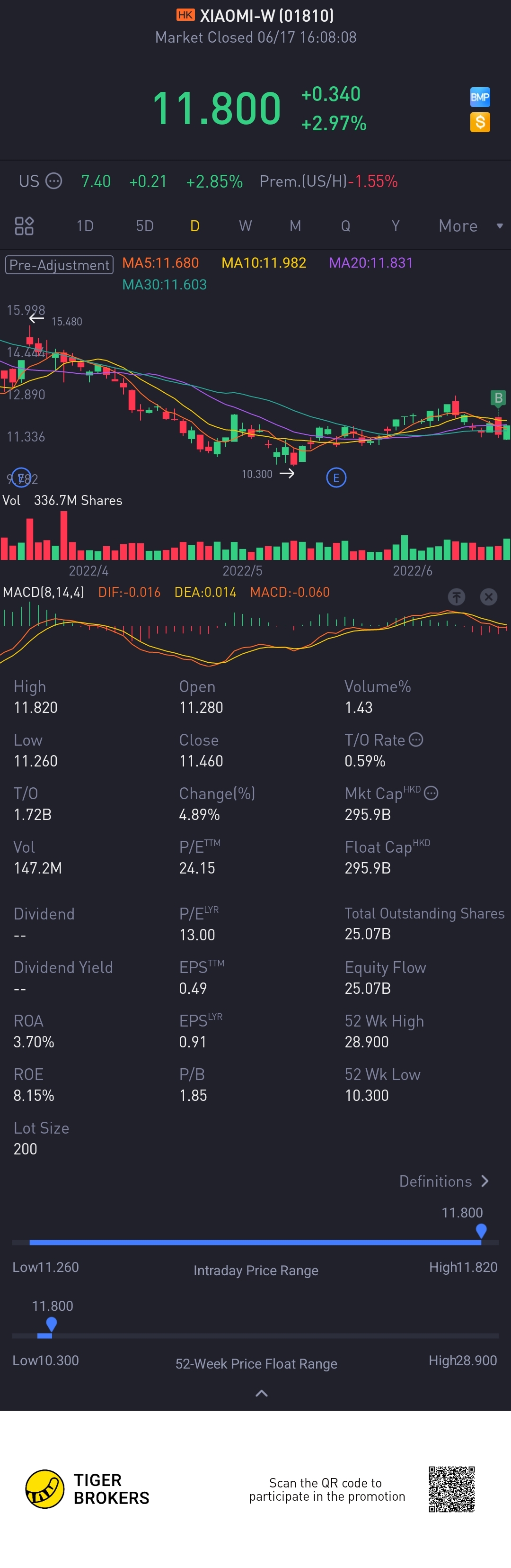 $XIAOMI-W(01810)$HK market seems stabilize, already broke the long term down trend line. Buy the dip... vested Xiaomi ^-^