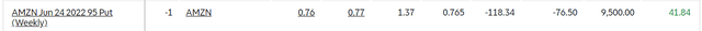 In simple words, we are collecting $119 to buy 100 shares of Amazon at $95 if the stock reaches $95 or below by June 24th, 2022. The positive value shown in green in the image above [41.84] is because the same chain is now only valued at 77 cents per share as Amazon's stock has increased since we sold this put, which puts our strike price farther from the current share price. Not to mention, time decay is in favor of the option seller.