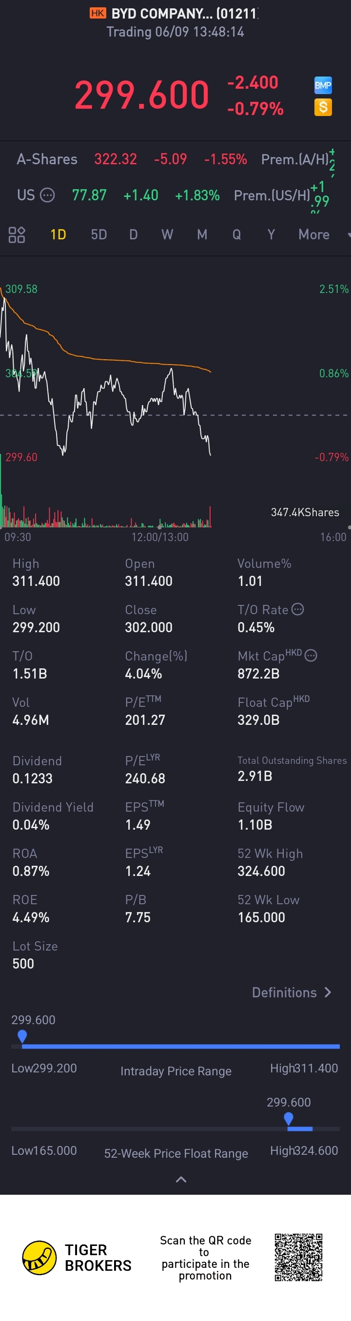 $BYD COMPANY(01211)$a month back this was just 219. Despite market upheaval it is still going strong.