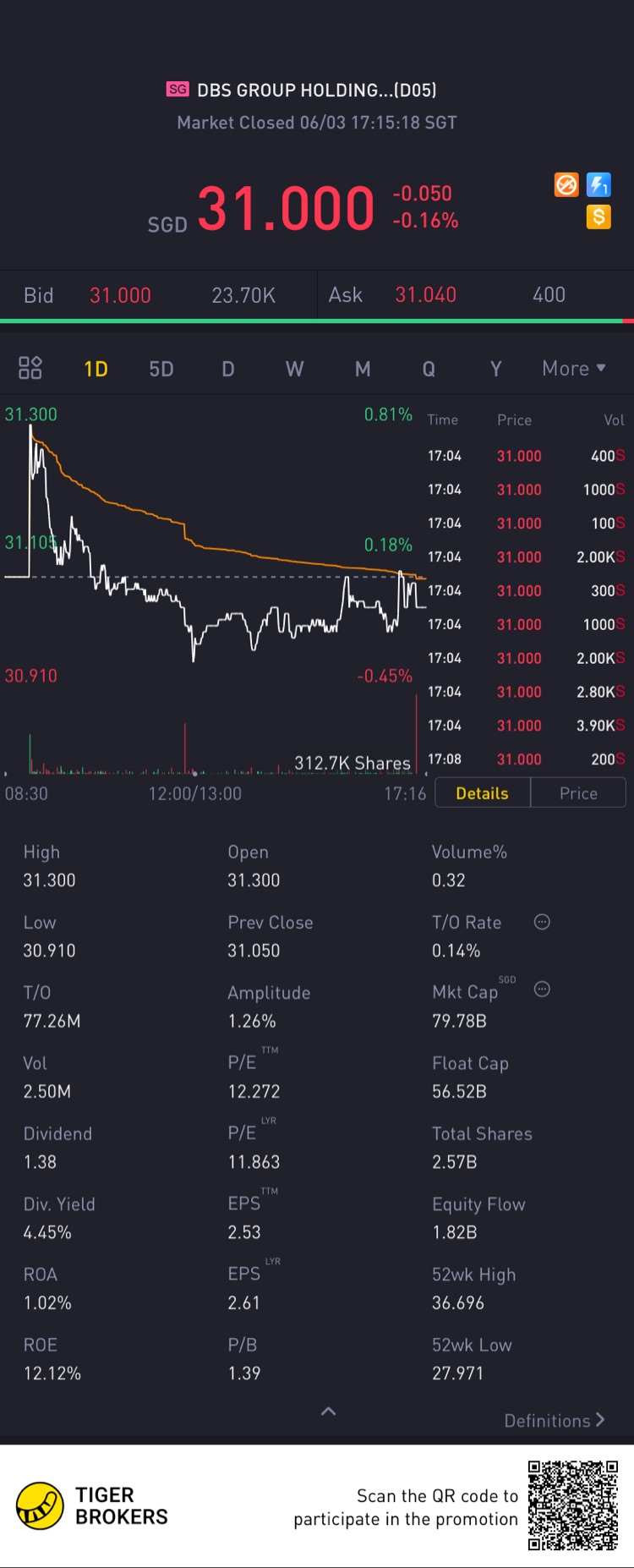 $DBS GROUP HOLDINGS LTD(D05.SI)$It has higher dividend payout than putting monies in fixed deposit. Buy it when the price is relatively low togain dividend and capital return. Bank sector will benefit from the raise of interest rate.