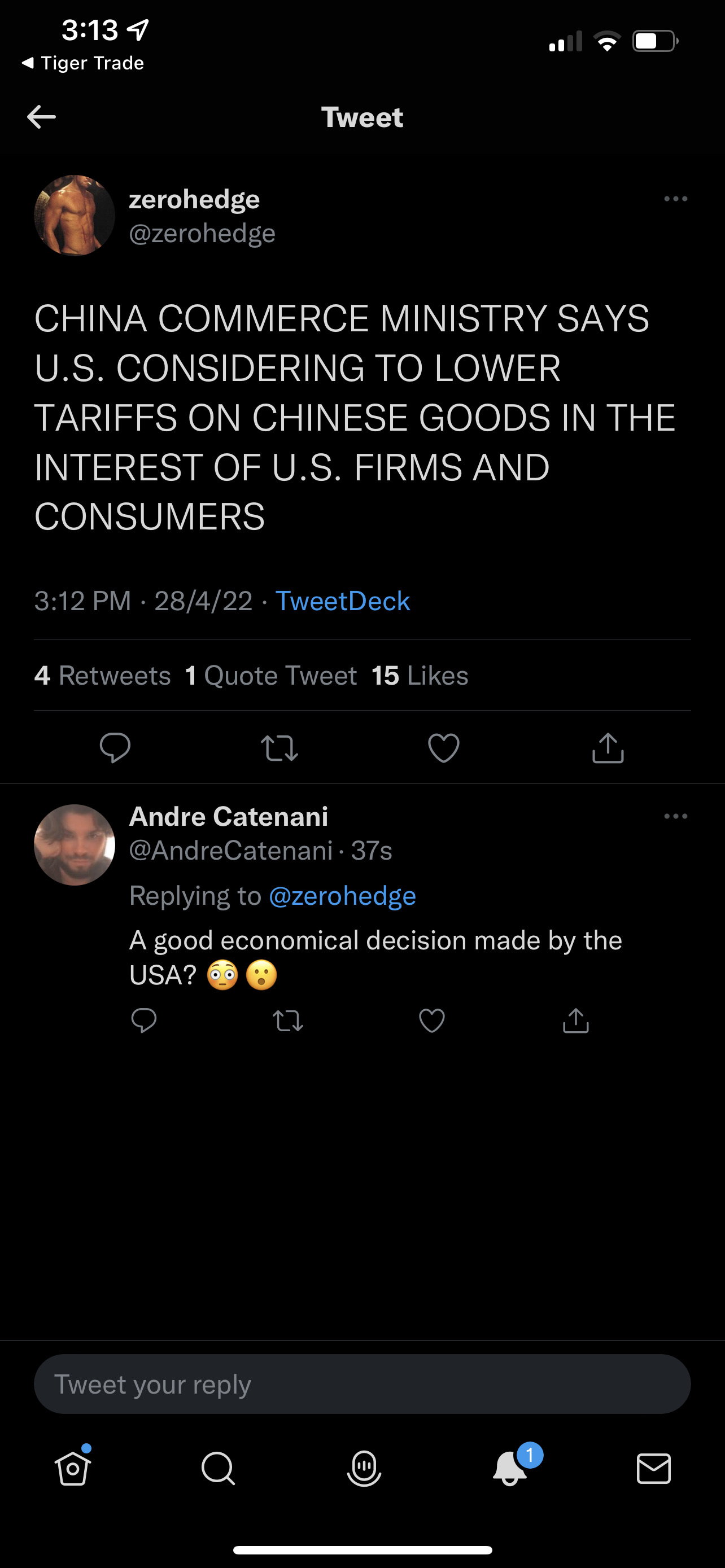 $Tiger Brokers(TIGR)$ Cool. China and the US getting better in relationships? Smart move by the US, they know they cannot afford to sanction or kick another country aside. This decision will better boost US and China economy. You see how China is still buying oil from Russia but the US can't do anything? Because if they do, the US will hit a dot com bubble crash, possibly.