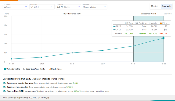 The stock might be heading in one direction only, but promisingly, with Q1 earnings anticipated on May 10, one trend is pointing in the other direction. Namely,website traffic, which is up considerably.