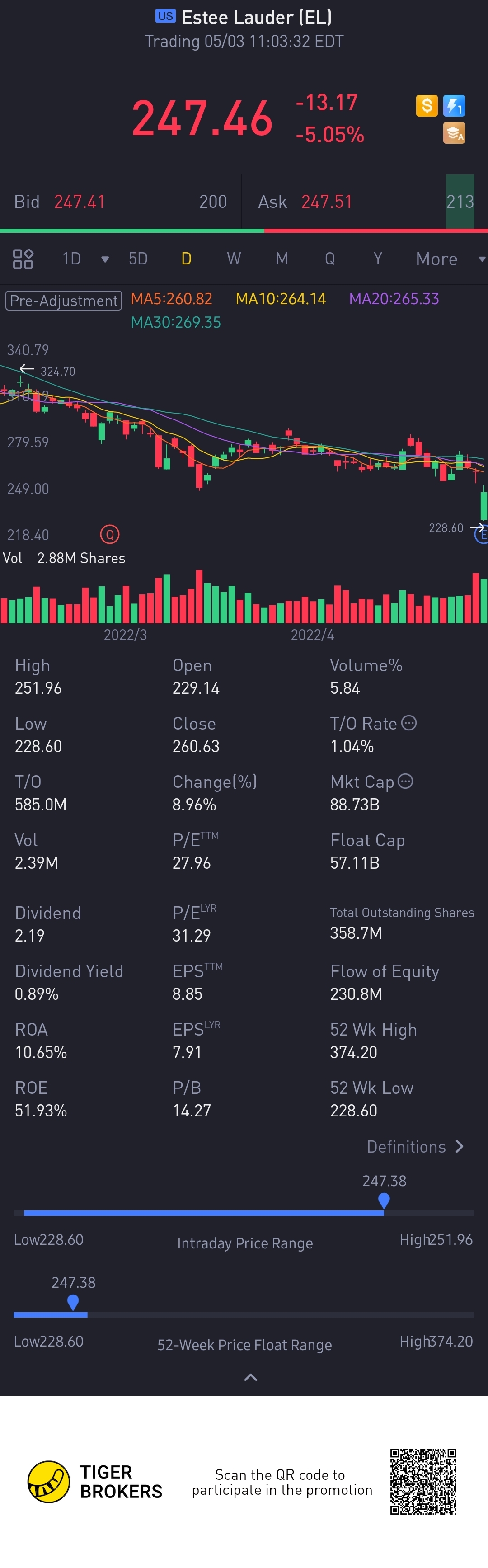 $Estee Lauder(EL)$a good short candidate. They are falling off multi year highs expect slow markets for 2022 and should see a correction of 10-15 pc more.