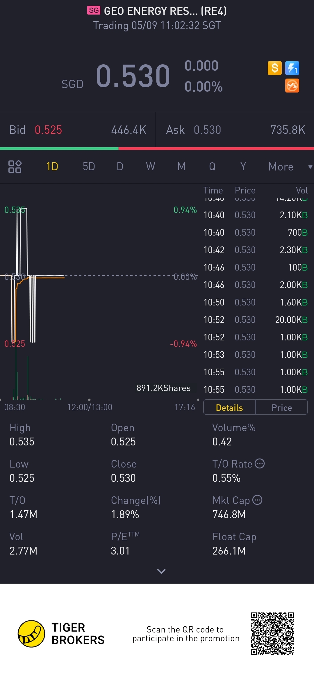 $GEO ENERGY RESOURCES LIMITED(RE4.SI)$ Today volume is low as compared to previous week. Have to be patience for this stock. Soon will rise if Bb push.