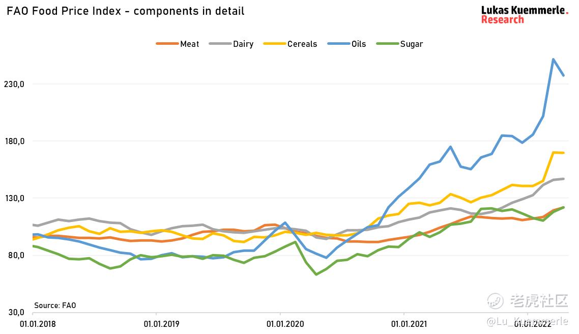 If we look closer at the sub-components of the index, we can see that meat, sugar and dairy products surged further in price, while cereals were as good as unchanged. Oil prices made a difference this month, which fell by over 5%.