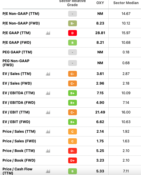 As we can see, OXY is cheaper than the average energy stock on the following metrics: