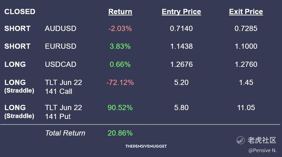 - Exited straddle on TLT in anticipation of long yields turning lower, for a net gain of 18.4%