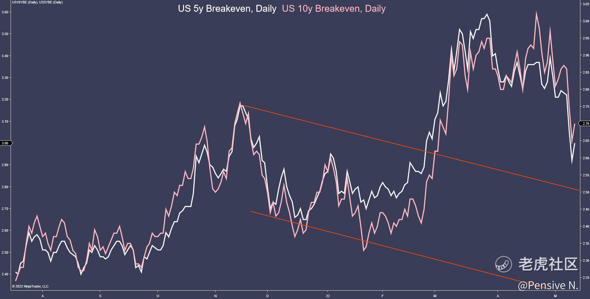 - Breakevens are plummeting, and are back below November 2021 levels even as inflation remains stubbornly high