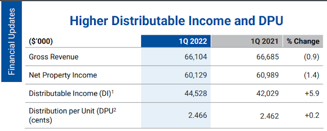 The fortunate thing is that investors since to have recovered from the initial shock and DCR has since recovered to US$0.995 per unit at the end of April 2022 last trading date. Many investors continue to keep faith in DCR and its sponsor. As for me, I continue to keep my distance away from DCR-please seemy last post on this. My issue has always been about the unbelievable extremely low distribution yield of 4.18% and 4.63% expected from DCR at a price of US$1.00 per unit for the 1st year and 2nd year respectively projected during IPO and the US withholding tax risk that makes holding on to it not worthwhile. Not to mention that DCR just IPO and then in record time, we have a major tenant default risk event occurring, this does not bode well for its sponsor's reputation.Nonetheless, if DCR drops below IPO price of US$0.88, I may decide to re-consider adding some of its units into my current portfolio.