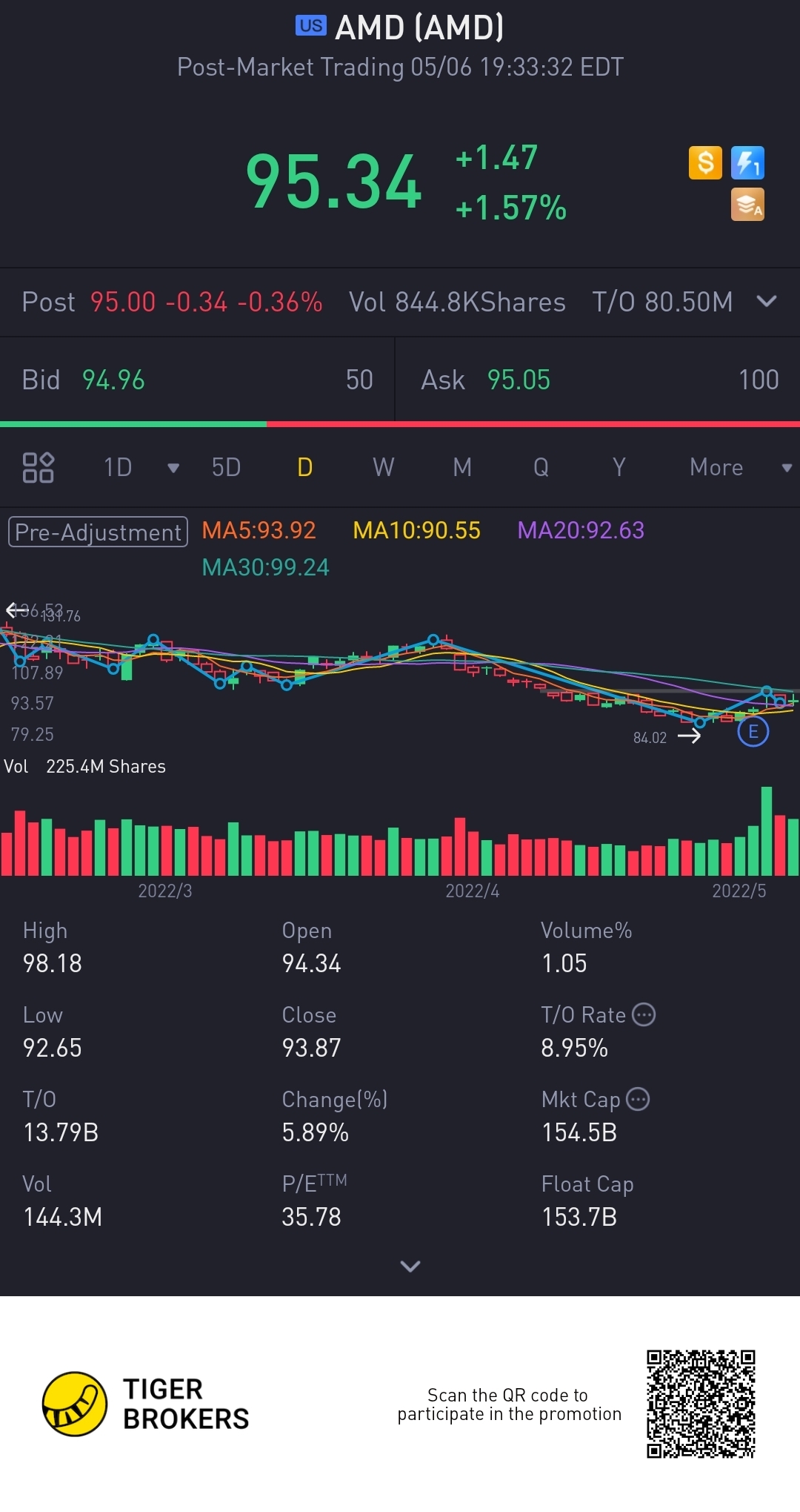 $AMD(AMD)$I was worried it was in red when market opened, despite it beating earnings. Luckily after half an hour, price went back 95-98 range. Let's make it past 100. đ
