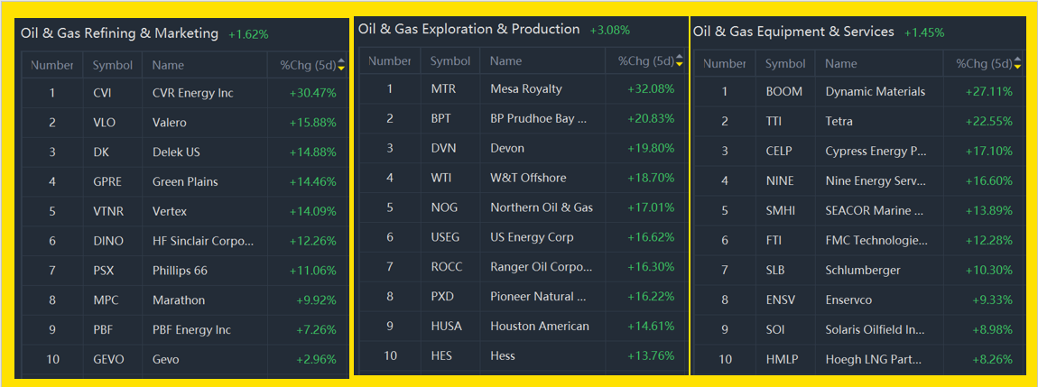 Inside the Energy Sector, Oil &Gas Refining & Marketing, Exploration & Production, Equipment &Services industries all got good performance during last week.