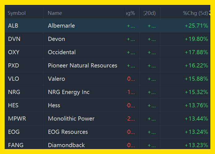 The TOP 10 performances of S&P 500 last week are $Albemarle(ALB)$,$Devon(DVN)$, $Occidental(OXY)$, $Pioneer Natural Resources(PXD)$, $Valero(VLO)$, $NRG Energy Inc(NRG)$, $Hess(HES)$, $Monolithic Power(MPWR)$, $EOG Resources(EOG)$, $Diamondback(FANG)$.