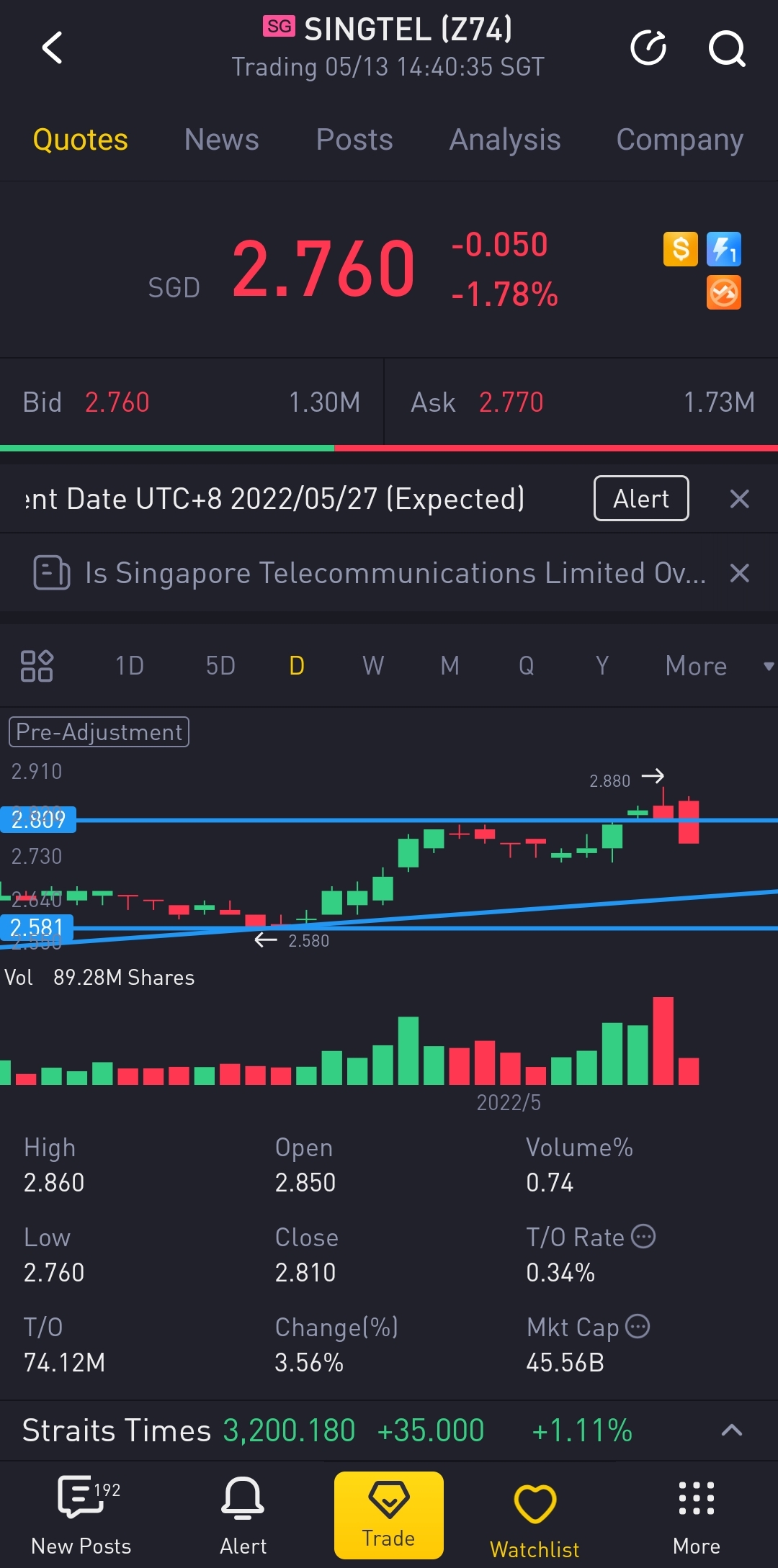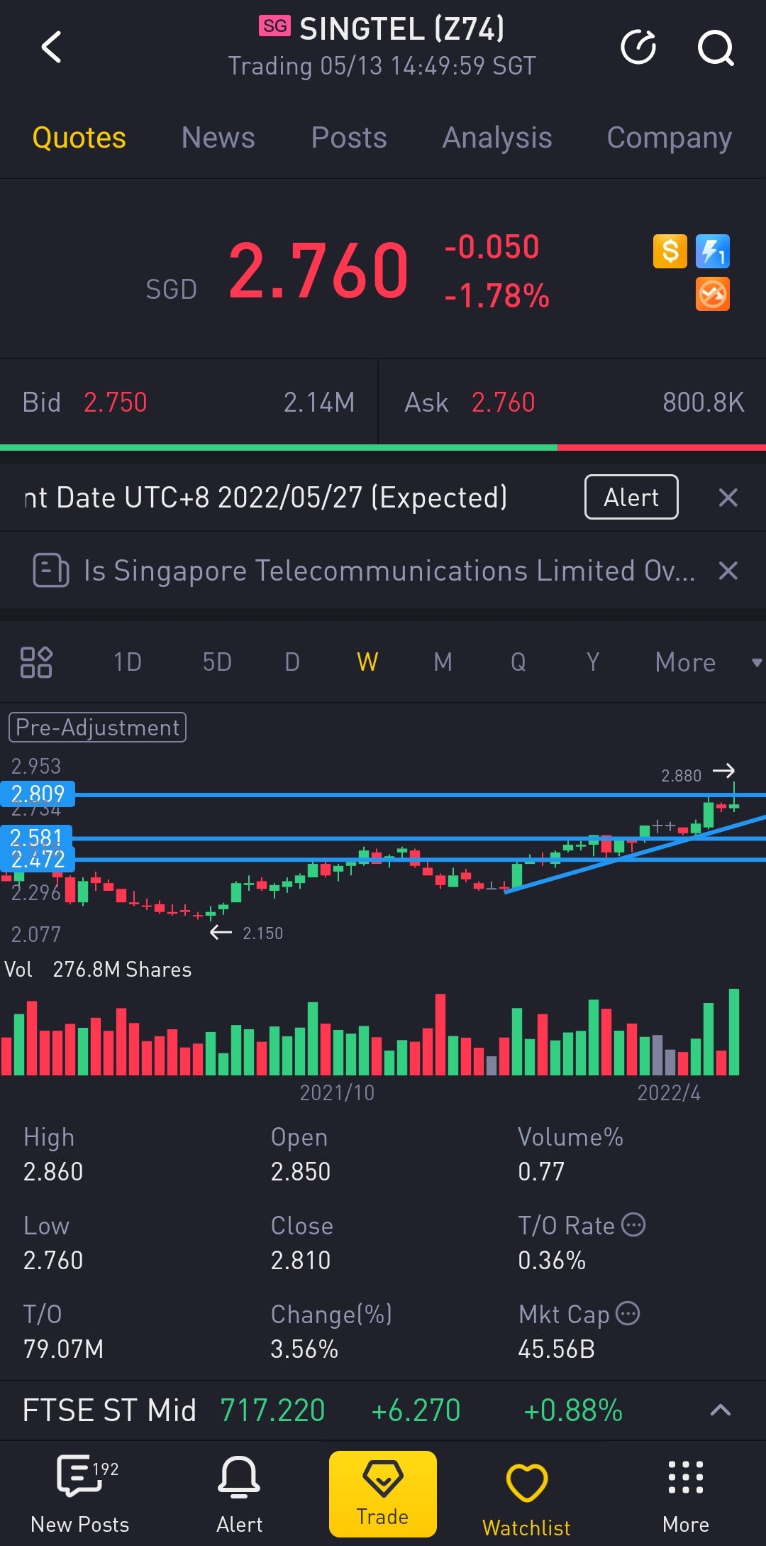 $SINGTEL(Z74.SI)$has been on a strong uptrend but formed a shooting star candle with high volume on 12 may 2022. This bearish candle with high volume suggests that big boys could be unloading. Coupled with today's big black candle, it confirms the occurrence of a short term top. Switch to the weekly chart and a shooting star candle stands out.