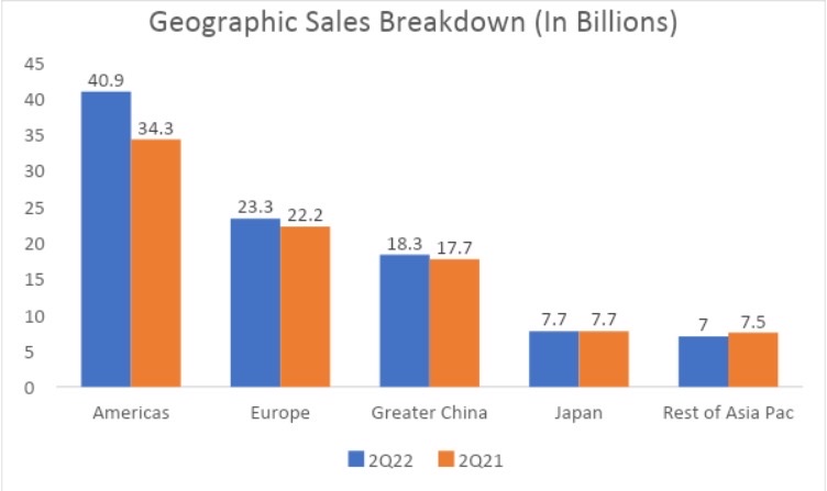 Compared to 2Q2021, 2Q2022’s sales rose 9% or US$7.7 billion, driven primarily from the strong performance of its Services, iPhone and Mac product segments.