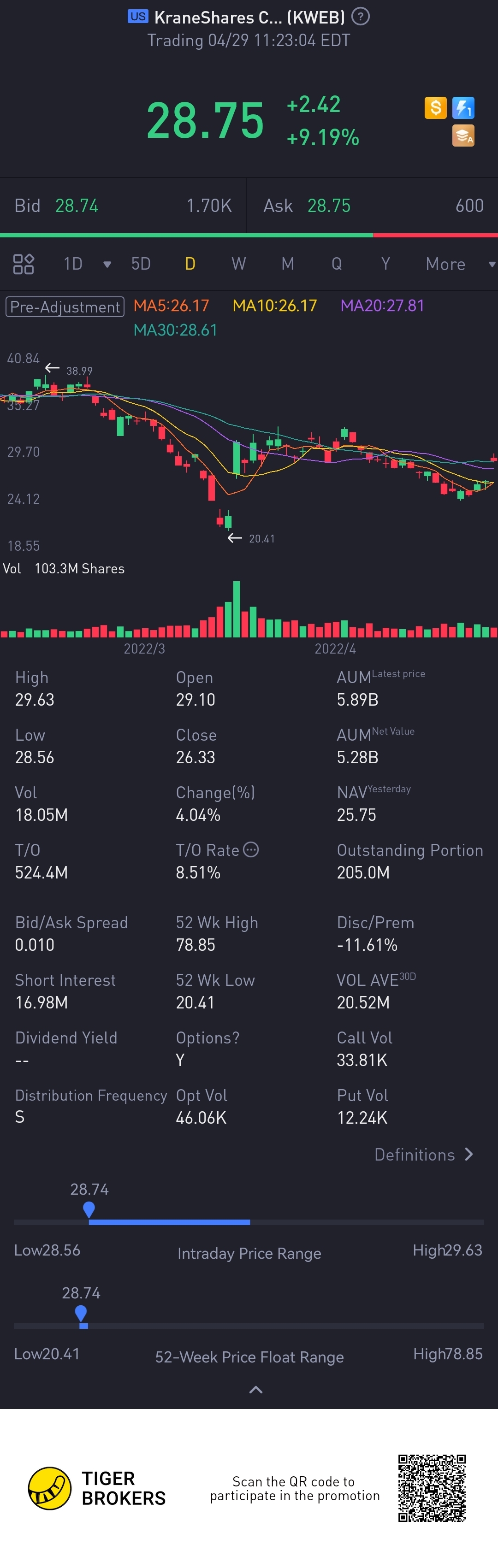 $KraneShares CSI China Internet ETF(KWEB)$ depsite going up high during market open but it show slowly going down