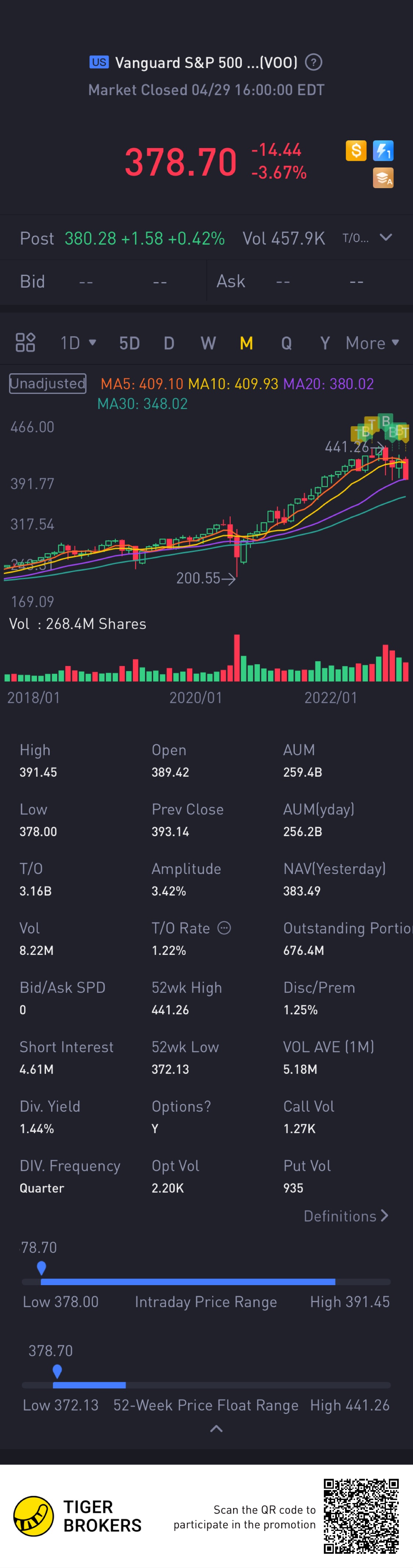 $Vanguard S&P 500 ETF(VOO)$Looking at the charts...I think it will still drop more as it has lost its major support. It's on sale now, looking to add more! 😉