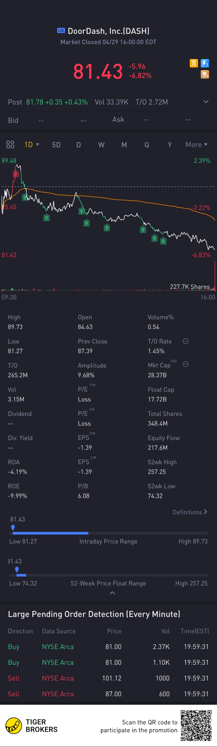 $DoorDash, Inc.(DASH)$Oh I came across this again and I am surprised it is now below it's IPO entry. Now would it be a nice entry to jump in just before its earnings? I don't know. What I do knowis they have been making losses since 2018 and their cash flow is not that much considering their debt is much higher. On the flip side, $Morgan Stanley(MS)$did gave an updated equal rate at $100. Let's see if I can get enough funds within thenext few days to dash in before their earnings release, and then out after it hehe