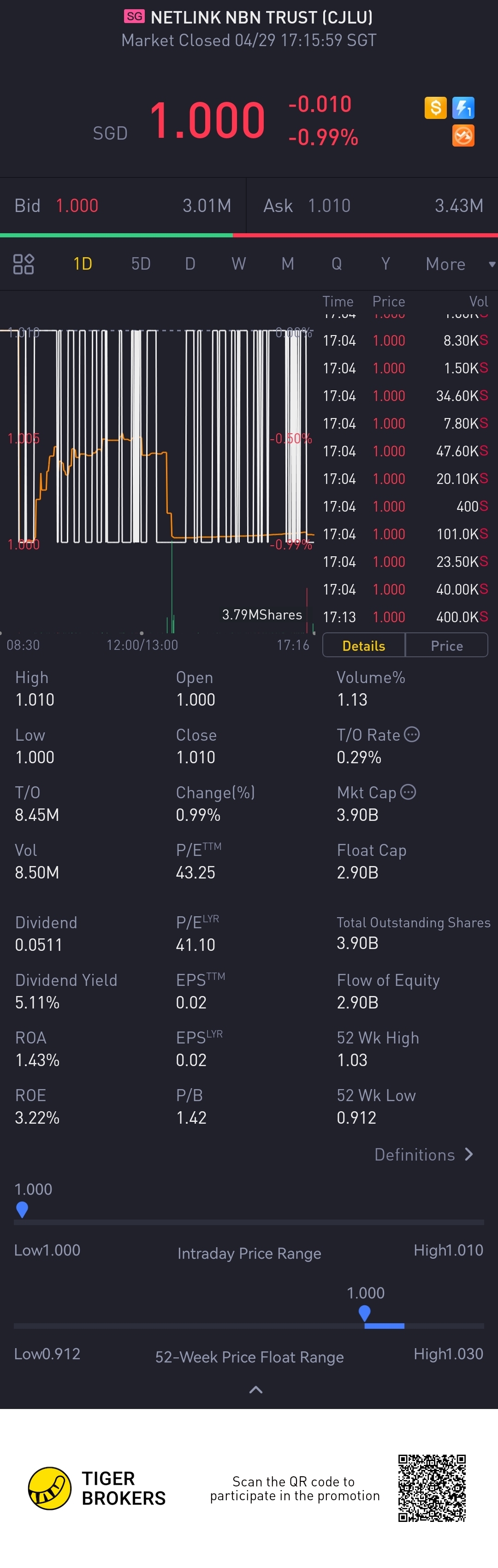 $NETLINK NBN TRUST(CJLU.SI)$ back to $1