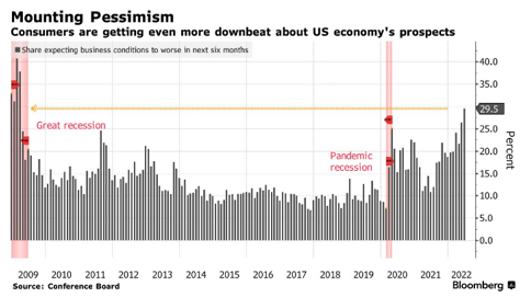 For example,Consumer confidence continues to decline.The University of Michigan consumer confidence index fell to an all-time low of 50 in June. Separately, nearly 30 percent of consultancy respondents expect business conditions to deteriorate over the next six months, the largest percentage since the height of the financial crisis in March 2009.