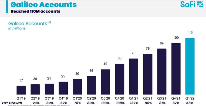 Second, SoFi believed it could fill many fintechs' and banks' crucial need for cutting-edge payment solutions with Galileo's services. And SoFi wound up being correct. Since SoFi bought Galileo, membership grew from 36 million in the second quarter of 2020 to 110 million in the first quarter of 2022.