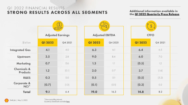 Shell took in $14.8 bn in OCF for Q-1, or $58 bn on a one year run rate basis. Capex ran to $4.2 bn, dividends cost another $1.9 bn, and ~$2.5 bn in debt was repaid. This left them with $6.2 bn to throw a share buyback party, and that's just what they did to the tune of $4.5. They expect another $4.0 bn of buybacks for the 2nd Qtr. Cash on hand rose by roughly the balance to ~$38 bn. Over the last year and a half the company has strengthened the balance sheet knocking $14 bn off the total, which now stands at $52 bn. A non-cash charge of $3.9 bn was taken for Russian asset divestitures.