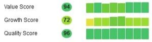 As seen in the chart at right, Intel consistently scored well on value and growth in the last eight quarters. According to Stock Rover, growth is less consistent but is still a 72/100 score.