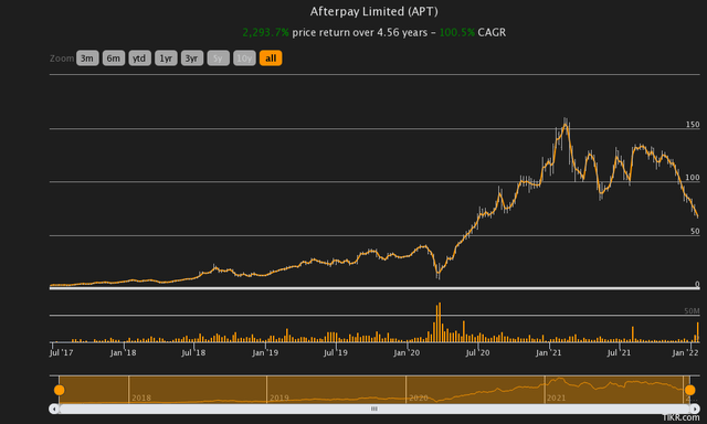 It is evident from Afterpay's graph that this company experienced speculation that it would cease sooner or later. From the time of the acquisition agreement in August 2021 the company basically lost 50% of its value until January 2022. From then on, it was no longer possible to trade its shares (acquisition completed by Block), but it is very likely that this stock would have continued its descent inexorably given the turn it took this year. Before the pandemic, this stock was trading at A$40 per share and I consider it very likely that it would be at an even lower price if it were still trading on the market. It could be that Block's management did not think it was likely to be financed by issuing shares in the following months, but in any case, Afterpay was paid through the nose. In the first two months of 2022 it turned over only $130 million, too little for what it was paid. Block capitalizes $37.5 billion after making a $29 billion acquisition at the end of 2021: not a great deal so far.